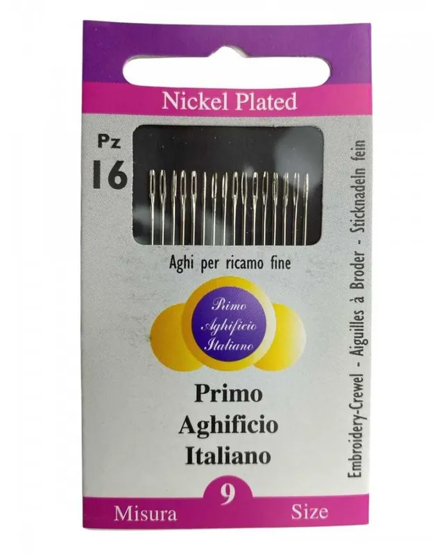Set da 16 aghi per ricamo fine misura 9, ideali per lavori di precisione, ricamo tradizionale, punto erba, punto pieno e dettagli decorativi. Realizzati in acciaio nichelato, scorrono facilmente sul tessuto garantendo un risultato pulito e uniforme.