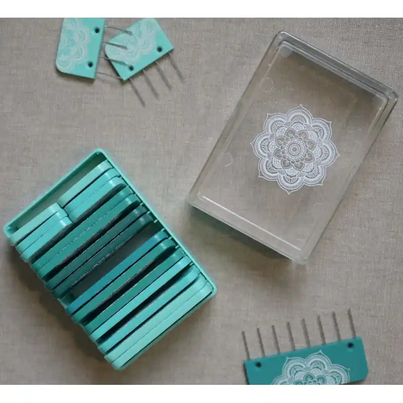 I pins sono realizzati in acciaio inossidabile, molto resistenti. I blockers sono in plastica, a forma di piccoli pettini, e presentano un design caratteristico della collezione KnitPro Mindful con fiori mandala.