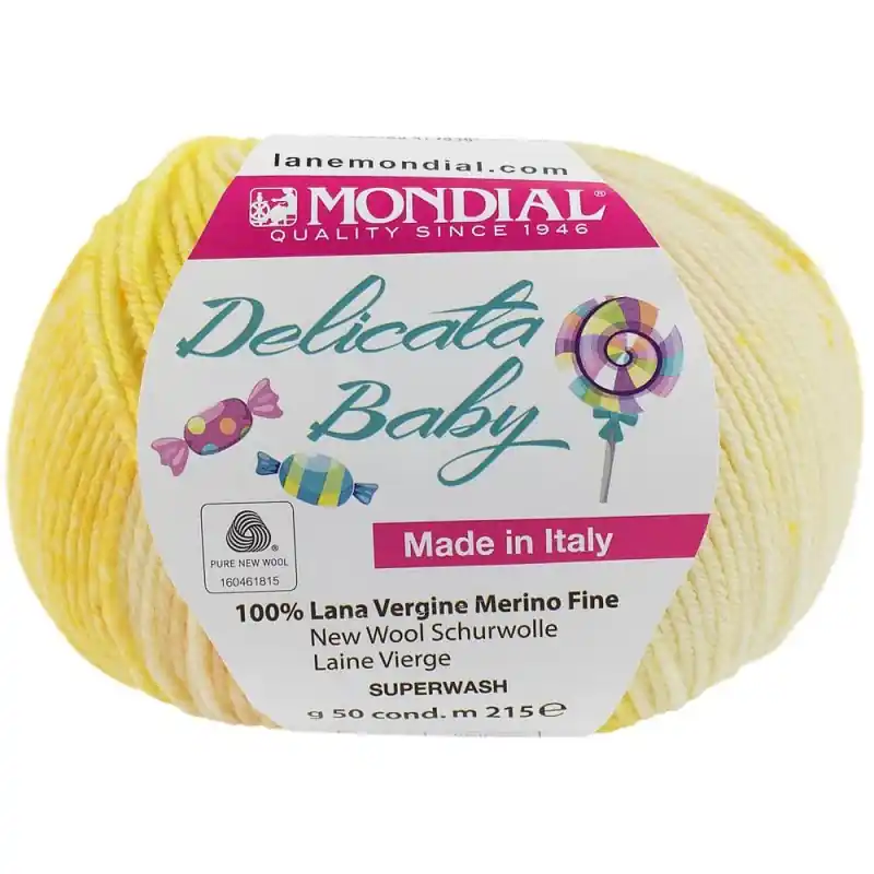 Mondial presenta Delicata Baby Stampe. È un gomitolo di pura lana vergine, ottenuto dalla prima tosatura di una pecora Merino. Grazie al trattamento Superwash, ottieni una lana morbida e soffice al tatto, che tratterà delicatamente la pelle dei bambini. Inoltre, puoi lavarlo in lavatrice senza timore che si rovini facilmente.