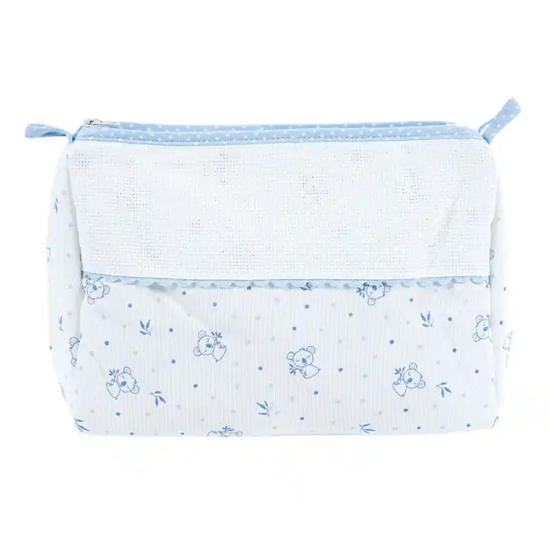 L’esterno del necessaire è realizzato in tessuto 100% cotone, con un design stampato di koala baby e pois. L’interno del beauty case è dotato di un rivestimento plastificato 100% poliestere, che offre una protezione ottimale. Include una chiusura con cerniera.
