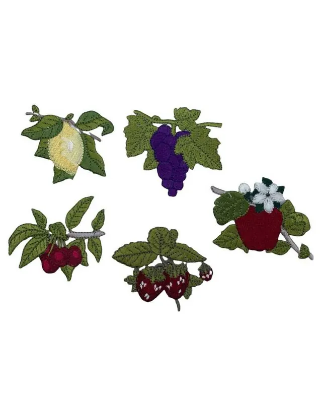 Applicazione termoadesiva ricamata raffigurante un ramo di frutta con foglie, dimensioni 55×50 mm. Realizzata con filati di alta qualità in poliestere e rayon, questa patch è perfetta per personalizzare capi d’abbigliamento e accessori con un tocco vivace e naturale. Disponibile in vari soggetti: ciliegie, limone, mela, uva, fragole — tutti ricamati con cura e dettagli cromatici realistici.