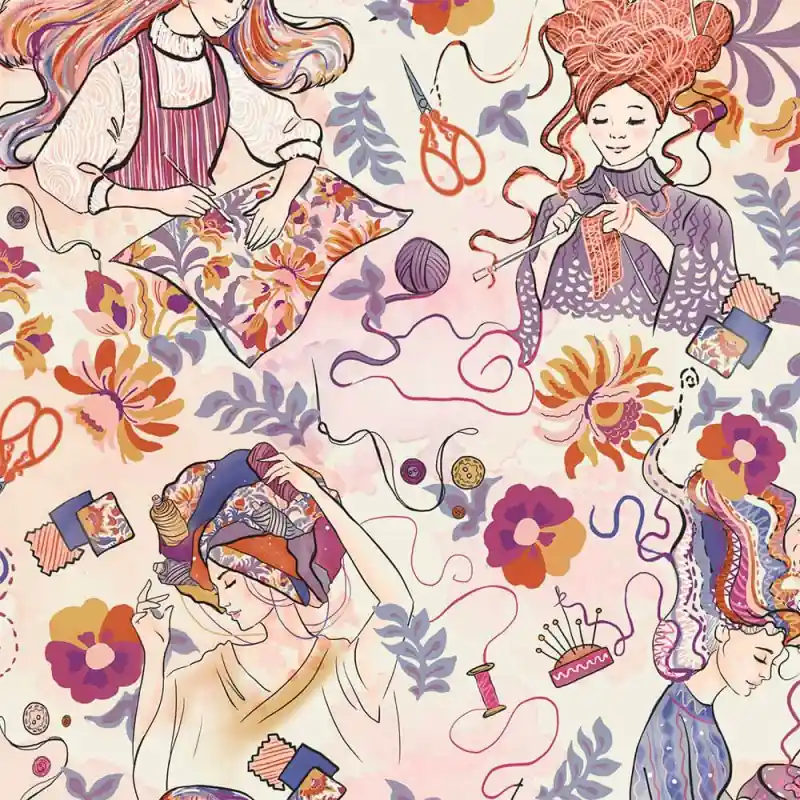 Il Tessuto Poplin Katia Knit & Sew Dreams è un tessuto in popeline 100% cotone che celebra l’universo del lavoro a maglia e del cucito con una stampa originale e piena di fantasia. Su uno sfondo chiaro, sono rappresentate illustrazioni di donne che lavorano a maglia e cuciscono, circondate da fiori, gomitoli, aghi, forbici e dettagli incantevoli nei toni del lilla, senape e rosa.