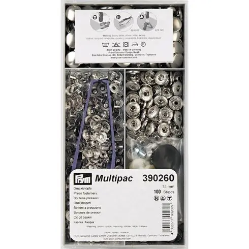Multipac di 100 chiusure a scatto con 15 mm Anorak river in ottone inossidabile color argento. Per giacca a vento, abiti, gonne, pellami pregiati. Fornito con un piccolo attrezzo di montaggio. Da fissare con martello o clip Vario Codice PRY n°390900.