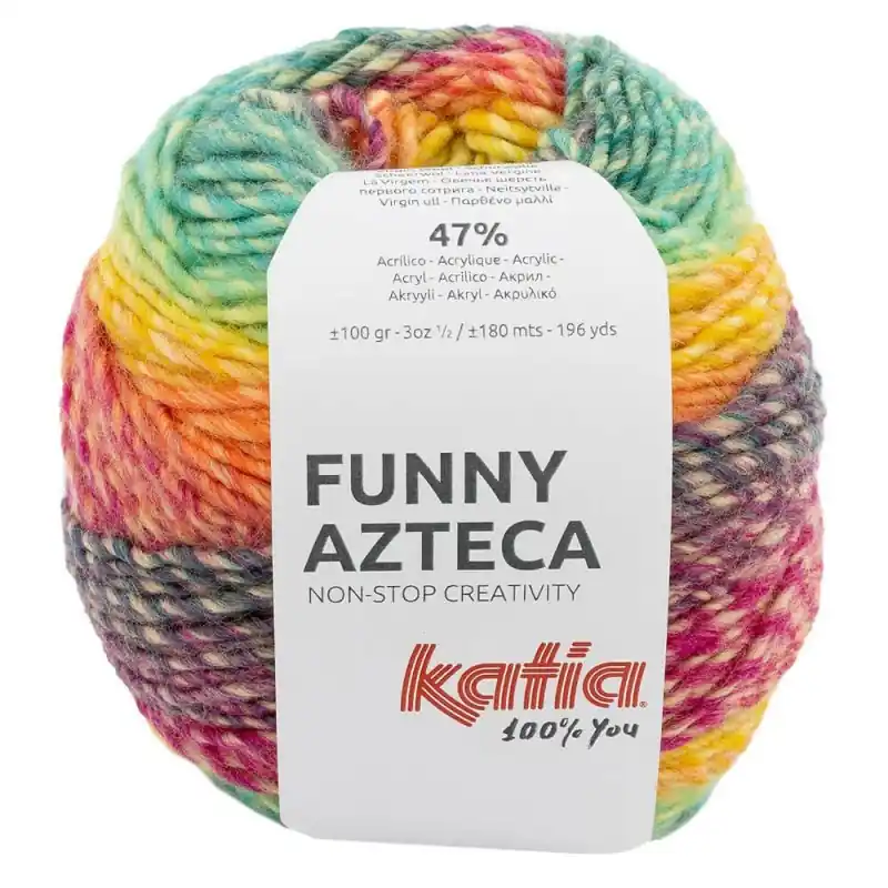 Funny Azteca è composto al 53% di lana vergine e al 47% di acrilico. Ogni gomitolo contiene 100 grammi e 180 metri di filato, e si lavora con ferri da 5-5,5 mm o uncinetti da 6-7mm. Dai libero sfogo alla tua immaginazione con Katia Funny Azteca!
