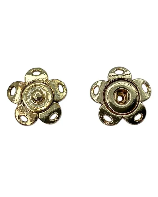 Il bottone è composto da due parti metalliche (maschio e femmina) con design floreale traforato, che consente una cucitura stabile grazie ai fori ovali su ogni petalo. Il meccanismo a pressione è robusto e funzionale, perfetto per capi strutturati e accessori fashion. La finitura lucida dona eleganza e versatilità.