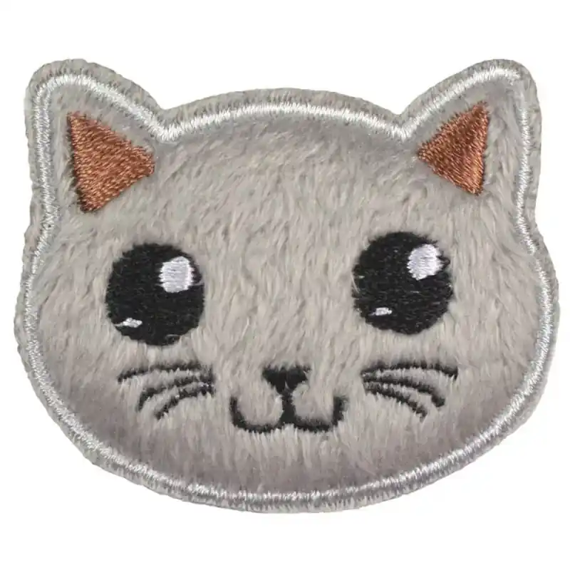 Design tenero: Toppe termoadesive con faccina di gatto ricamata su peluche grigio e un’espressione amichevole.