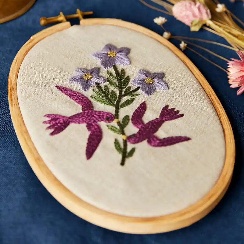 Il disegno presenta un’armoniosa combinazione di uccelli e fiori, catturati in una delicata tavolozza di colori che include sfumature di viola, malva e verde, trasmettendo un senso di serenità e bellezza naturale. Il kit comprende un telaio ovale perfetto per incorniciare la composizione ricamata di uccelli in volo. Inoltre, è anche pratico come aiuto durante il processo di ricamo.