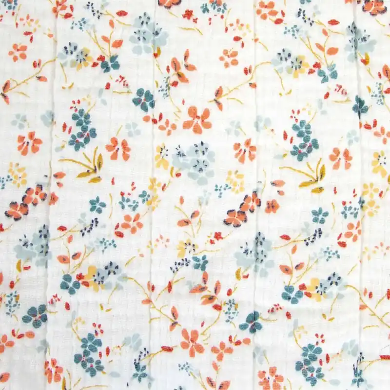 Il Tessuto Padded Mussola Print Katia – Forest Flower unisce funzionalità ed estetica in un design accogliente. È realizzata in tessuto di mussola trapuntata con ovatta, con un delicato motivo floreale su sfondo bianco, perfetto per creare progetti morbidi con un tocco naturale ed elegante.