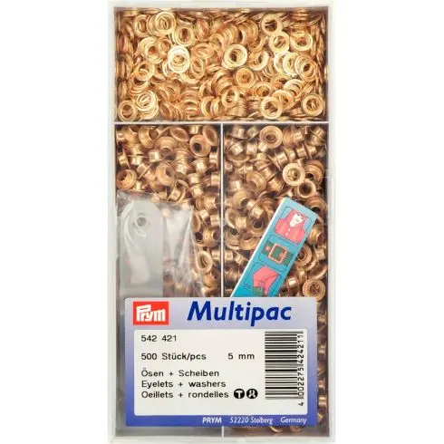 Multipac da 500 occhielli con rondelle in ottone dorato da 5 mm. Fornito con un piccolo utensile di regolazione. Da fissare con martello o clip Vario Codice PRY n°390900.