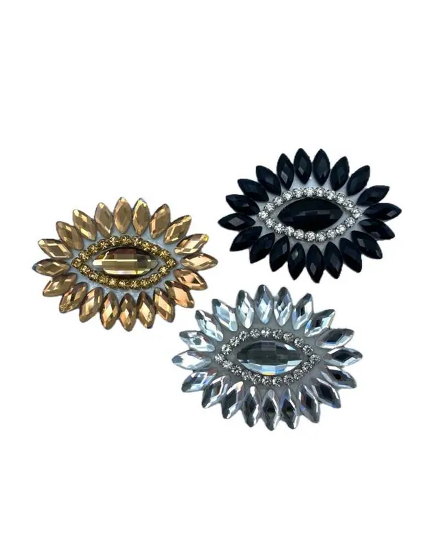 Applicazione elegante e scintillante a forma di fiore, composta da petali in pietre sfaccettate e strass centrali. Perfetta per dare luce e personalità a capi e accessori.