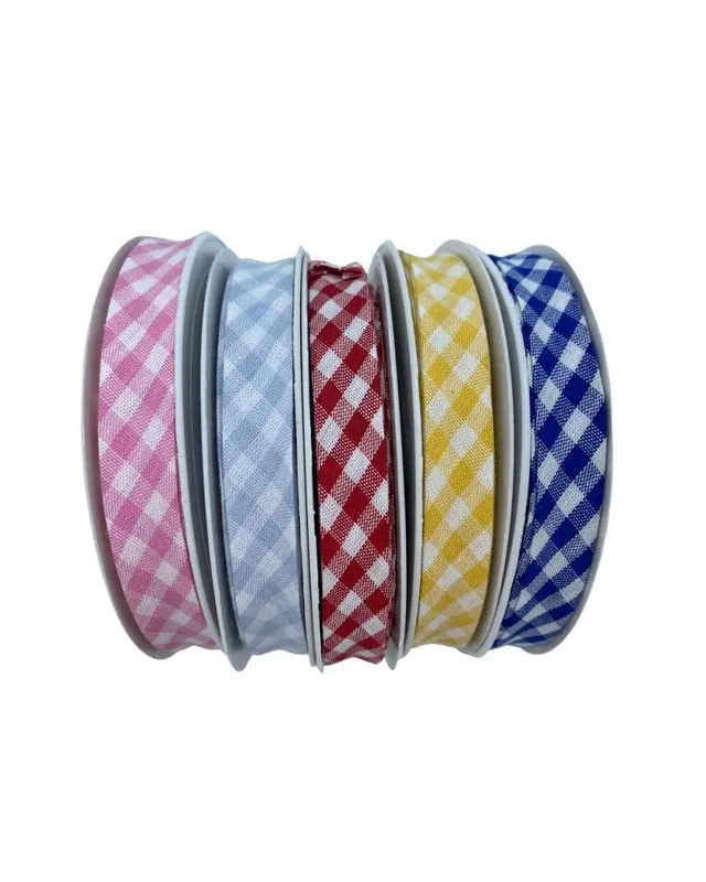 Nastro sbieco diagonale in cotone scozzese, largo 14 mm, ideale per fiocchi nascita, corredo baby e tendine. Lavabile a mano e venduto al metro con taglio continuo.