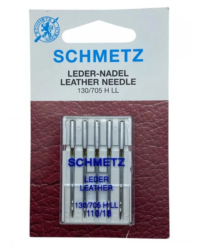 Set di 5 aghi Schmetz Leder-Nadel 130/705 H LL 110/18, ideali per cucire cuoio e pelle. Alta qualità e precisione per macchine da cucire domestiche.