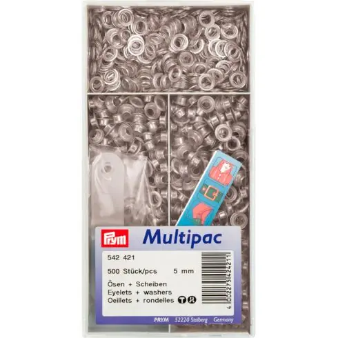 Multipac da 500 occhielli con rondelle in ottone inox argento da 5 mm. Fornito con un piccolo utensile di regolazione. Da fissare con martello o pinza Vario Codice PRY n°390900. Trovate tutti gli articoli necessari per realizzare i vostri progetti nella nostra merceria online.