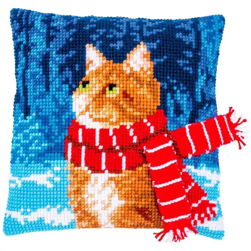 Il Kit Punto Croce Gatto con Sciarpa di Vervaco ti permette di creare un adorabile cuscino con un gatto arancione che indossa una sciarpa rossa a righe, circondato da un paesaggio invernale. Un design pieno di tenerezza e colore che aggiunge un tocco caldo e natalizio a qualsiasi angolo della casa.