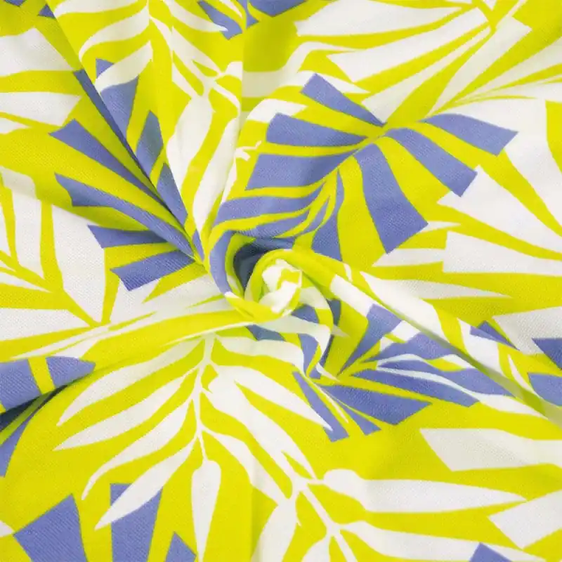 La sua stampa tropicale con palme in colori vivaci su sfondo giallo offre un look dinamico, moderno e pieno di personalità. Ideale per la realizzazione di polo, magliette, vestiti o completi per bambini, questo tessuto è tanto versatile quanto stiloso, adattandosi perfettamente a modelli per donne, uomini e bambini con estrema naturalezza.