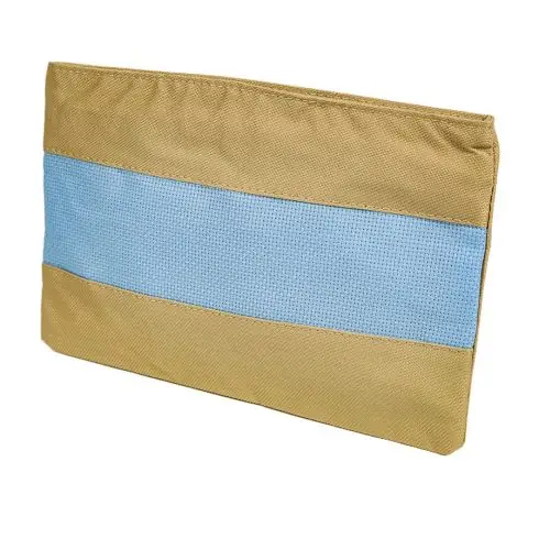 Astuccio in tessuto beige e blu con fascia in tela Aïda 5,5 (14ct.) blu, chiusura con cerniera.