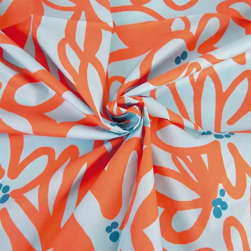 Il suo design floreale accattivante presenta grandi fiori di tiaré in tonalità corallo arancione su uno sfondo turchese luminoso, creando un contrasto vibrante e sofisticato. Perfetto per realizzare capi estivi come vestiti, bluse o gonne, così come complementi e accessori per la casa che aggiungano colore e freschezza.