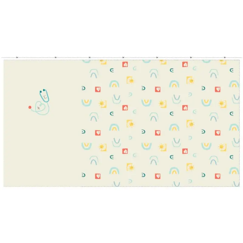 La fantasia del tessuto rende omaggio ai sanitari. La stampa per la parte frontale della maglietta raffigura un fonendoscopio a forma di cuore, uno strumento molto caratteristico dei dottori. Per le maniche e per la parte posteriore il pannello offre un tessuto stampato di arcobaleni, cuori e soli splendenti.