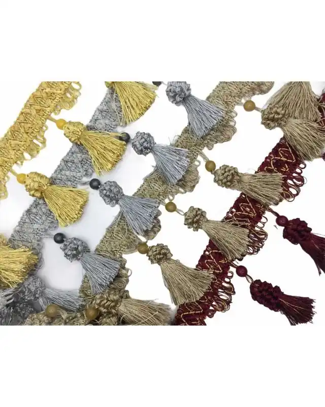 Acquista la passamaneria frangia nappine con perlina alta 12 cm in 100% poliestere. Perfetta per tappezzeria, lumi, paralumi, tovaglie, borse e abbigliamento. Taglio continuo disponibile.