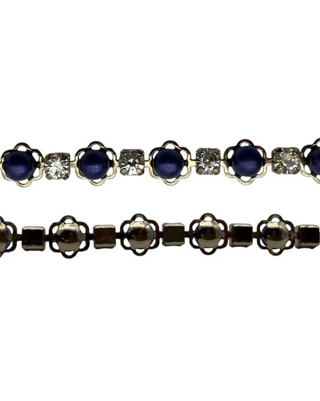Elemento decorativo raffinato e luminoso, perfetto per impreziosire abiti, accessori e creazioni sartoriali. La combinazione di metallo dorato, strass argento e perle blu dona eleganza e carattere.