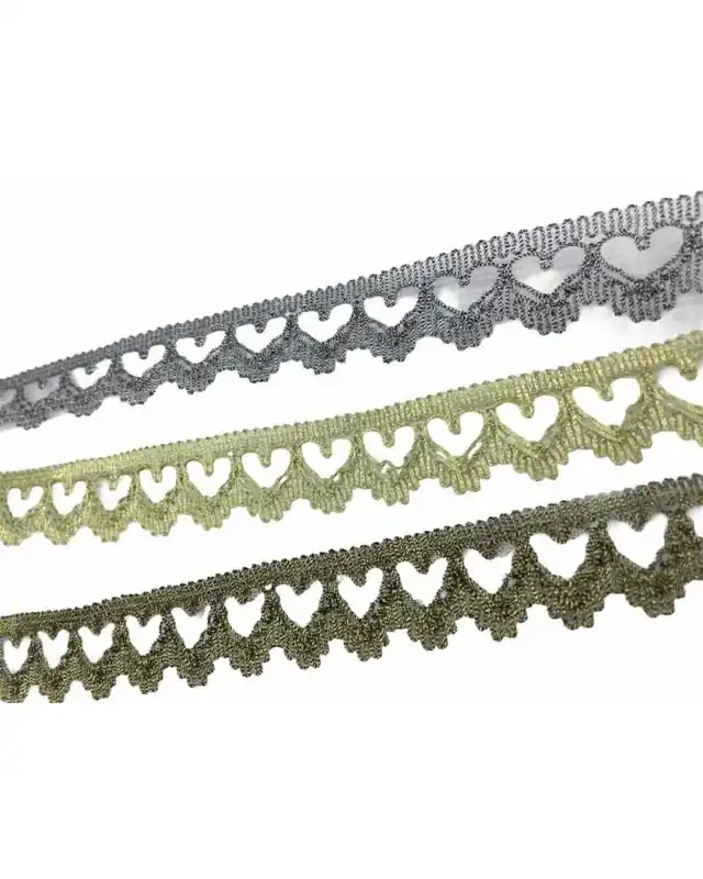 Una passamaneria brillante e versatile, perfetta per decorazioni d’arredo e creazioni scenografiche. Il motivo a cuori intrecciati su base trasparente, ricamato in filo lurex, dona luce e movimento a ogni progetto. Ideale per ambientazioni eleganti, costumi, spettacoli e feste a tema.