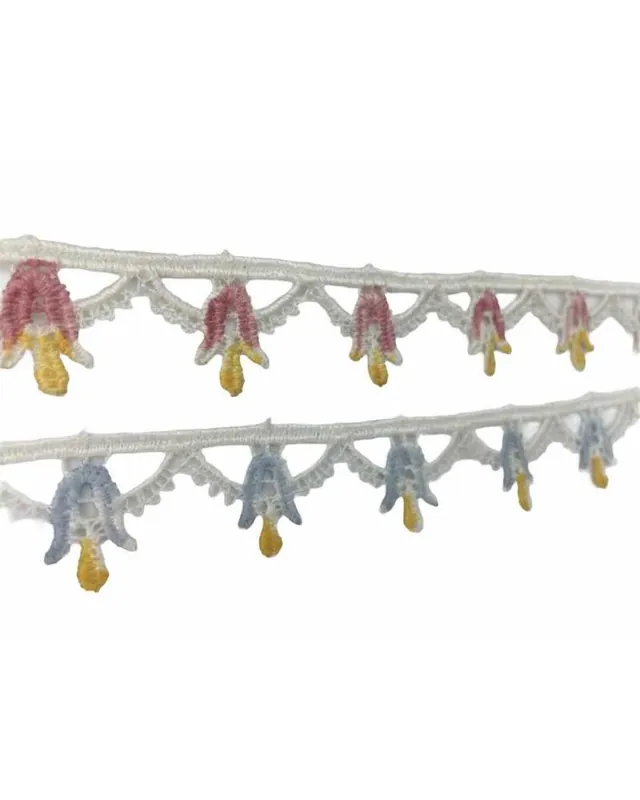 Passamaneria macramè puntina in pizzo ricamato, altezza 2 cm, disponibile nei colori celeste e rosa su base bianco latte. Ideale per decorazioni d’arredo e applicazioni sartoriali. Venduta al metro, con taglio continuo per quantità multiple.