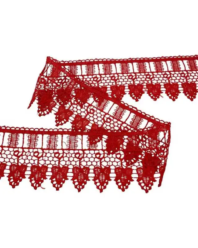 Passamaneria in pizzo macramè rosso intenso, con bordo a punta, ricamo floreale e passanastro centrale da 15 mm. Realizzata in 100% poliestere, è perfetta per rifinire capi d’abbigliamento, maglie, borse, accessori moda, e per decorare tovaglie, paralumi, centrotavola e articoli di tappezzeria.