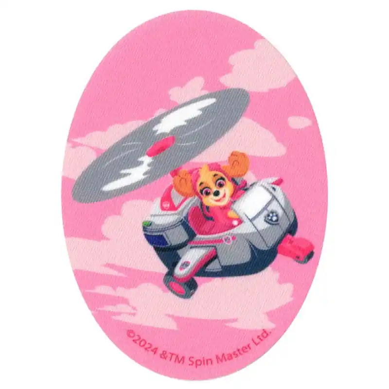 L’applicazione è rapida e semplice con il ferro da stiro, senza bisogno di cucire. Il design mostra Skye che pilota il suo caratteristico elicottero su un cielo rosa con nuvole, trasmettendo avventura, simpatia e dinamismo.