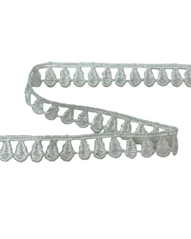 La passamaneria presenta un disegno a goccia traforata, con ricamo compatto e simmetrico. Il bordo inferiore è puntinato, con piccole curve che seguono il profilo delle gocce, creando un effetto leggero e raffinato. Il filo in poliestere è resistente e mantiene la forma, ideale per cuciture su tessuti leggeri come cotone, batista, lino.