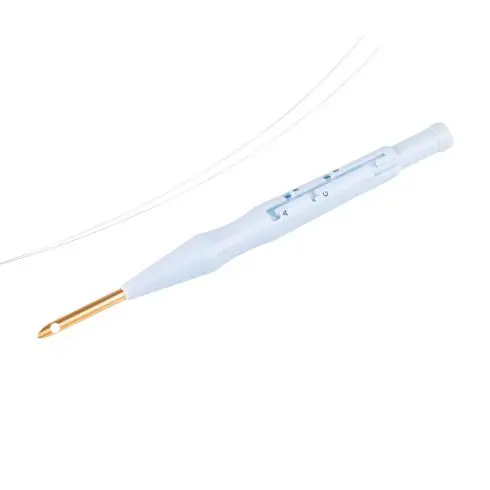 Aghi in plastica con 4 posizioni che permette di impostare l’altezza del cappio desiderata (24-34-43 e 53 mm) + infila ago per inserire il filo nell’ago.