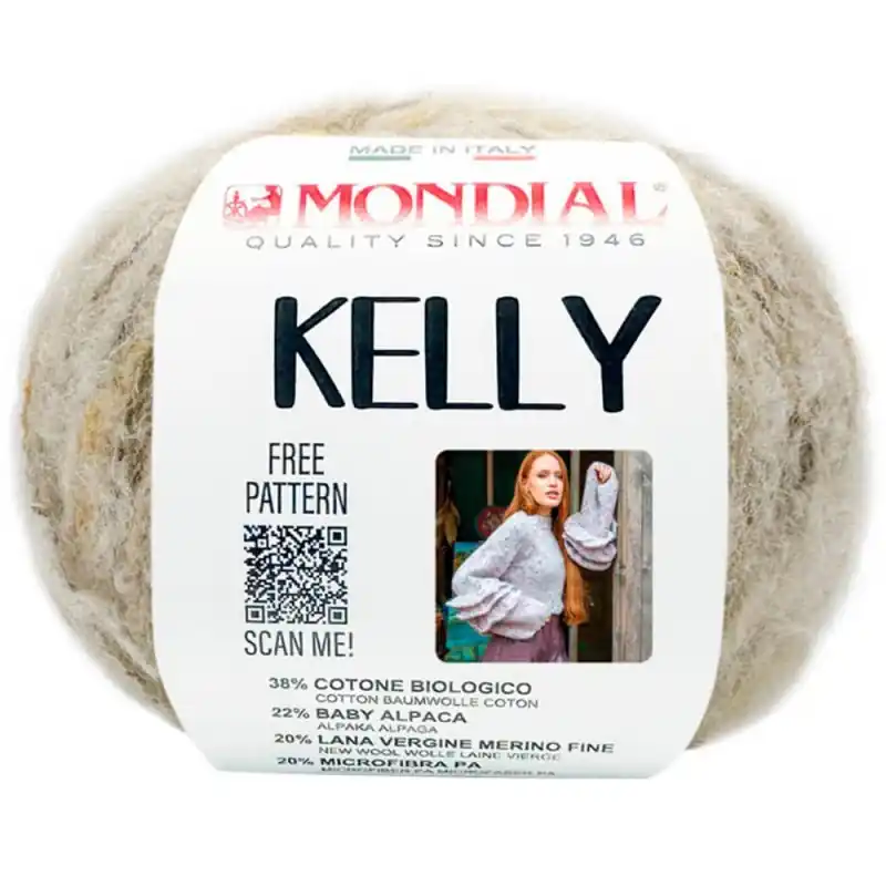Mondial Kelly è un filato di fantasia con una composizione unica, un mix di cotone ecologico, baby alpaca, lana merino fine e microfibra acrilica, che gli conferisce una texture morbida, leggera e molto piacevole al tatto.