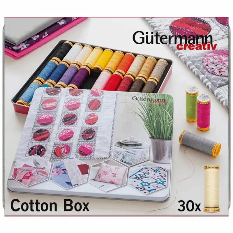 La Scatola metallica con 30 fili di cotone da cucire di Gütermann include 30 rocchetti di filo di cotone in un’ampia gamma di colori assortiti. È perfetta per cucire sia a mano che a macchina i tuoi progetti di cucito creativo, patchwork o quilting.