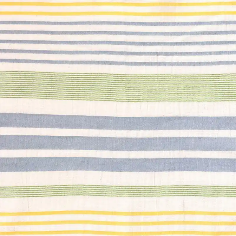 Il Tessuto Panama Katia Green presenta un disegno a righe in blu, verde e giallo che risaltano sullo sfondo in colore naturale, ideale per tutte le età: neonati, bambini o adulti.