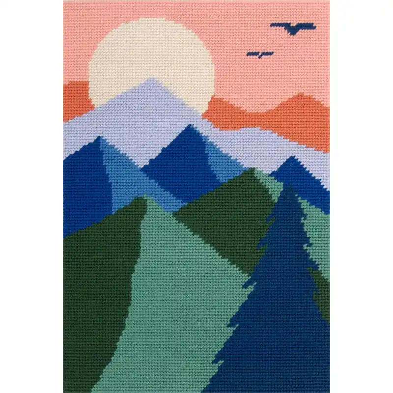 Il Canovaccio Penelope Stampato Montagne di DMC è un’opera d’arte in sé. Questo arazzo minimalista ti permette di ricamare una scena semplice e affascinante: un paesaggio montano con il sole che tramonta sullo sfondo.