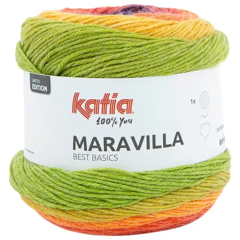 Katia Maravilla è un filato edizione limitata che ti sorprenderà con la sua incredibile combinazione di colori sfumati. Questo gomitolo da 200 grammi presenta una transizione fluida e armonica delle tonalità, ideale per creare capi con disegni simmetrici e vistosi. Con un solo gomitolo potrai realizzare uno scialle completo!