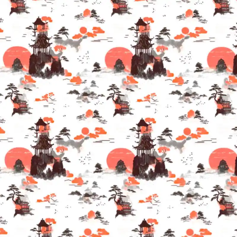 La Tessuto in Cotone – Paesaggio Giapponese è un tessuto 100% cotone con un design artistico e sereno ispirato all’estetica tradizionale del Giappone. Presenta pagode, montagne, alberi e un maestoso sole nascente in toni di rosso corallo e nero su uno sfondo chiaro, creando una composizione equilibrata, elegante e piena di bellezza culturale. Il suo stile pennellato richiama le tecniche di illustrazione orientale, conferendo un tocco sofisticato a qualsiasi progetto.