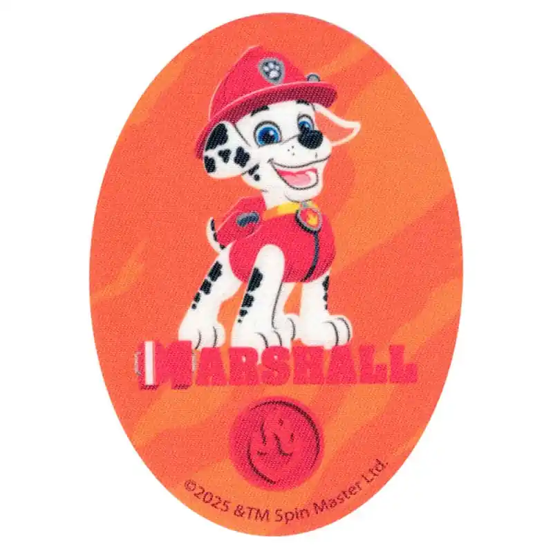 L’applicazione è semplice e veloce: si attacca con il ferro da stiro senza bisogno di cucire. Il design raffigura Marshall, il cucciolo dalmata pompiere, con la sua caratteristica uniforme rossa e uno sfondo in toni arancioni con effetto fiamma, accompagnato dal suo nome e dal simbolo del fuoco.