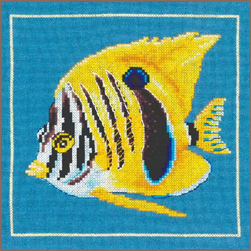 Dai un tocco tropicale ed esotico alla tua collezione di ricamo con il Kit di Punto Croce Yellow Zebra Fish di Lanarte. Questo colorato pesce zebra con pinne spiegate si distingue per la sua vibrante combinazione di gialli, neri e blu su uno sfondo blu intenso, incorniciato da una linea decorativa che ne esalta ulteriormente la forma e il dinamismo.