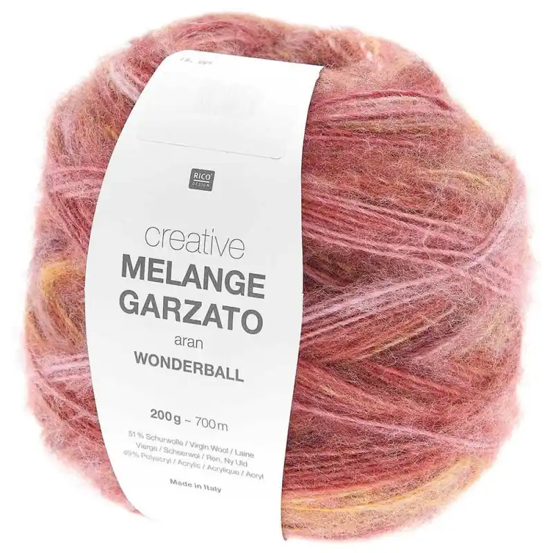 Rico Design Creative Melange Garzato Aran è una lana soffice multicolor. Si presenta in gomitoloni di grande formato, da 200 grammi e 700 metri.