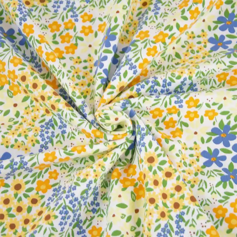 Il suo affascinante motivo floreale nei toni del lilla, verde, arancione e giallo richiama il calore dei campi di girasoli sotto il sole, creando una proposta visiva fresca, creativa e luminosa. È perfetto per abiti sportivi, magliette, pigiami e abbigliamento comodo per tutta la famiglia.