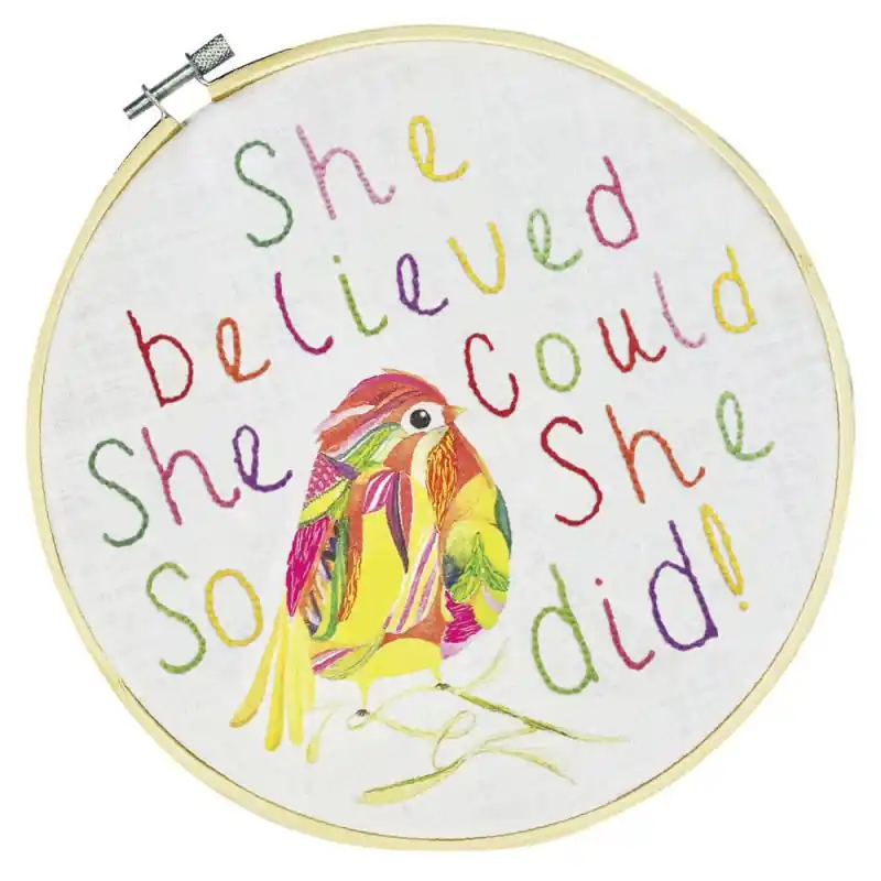 Fai i tuoi primi passi nel mondo del ricamo con il Kit di Ricamo per Principianti Uccello di Pony, ideale anche per bambini. Il design presenta un uccello allegro e colorato accanto alla frase motivazionale “She believed she could, so she did!”, perfetta per ispirare creatività e fiducia in ogni punto.