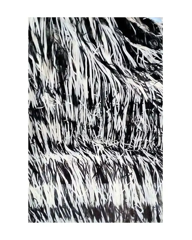 Tessuto frange tipo charlestone su base voile nero oro e bianco