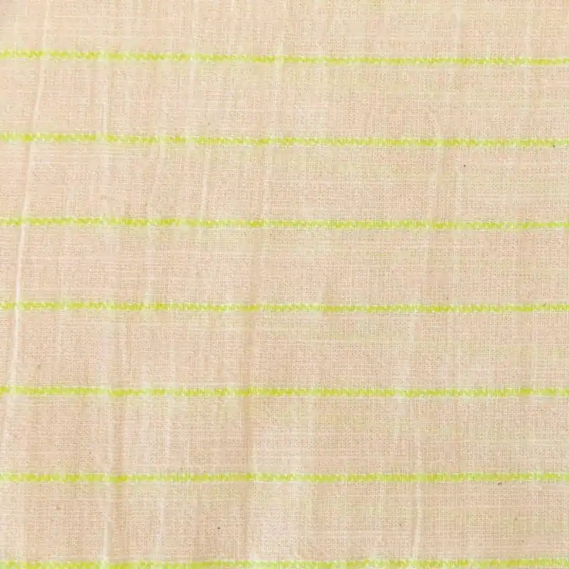 Il tessuto Katia Sari Fluor Yellow presenta un aspetto naturale con delle linee in colore giallo fluo che risaltano sullo sfondo del tessuto. È fresco, morbido e piacevole sulla pelle, con un effetto leggermente stropicciato. Ideale per primavera ed estate.