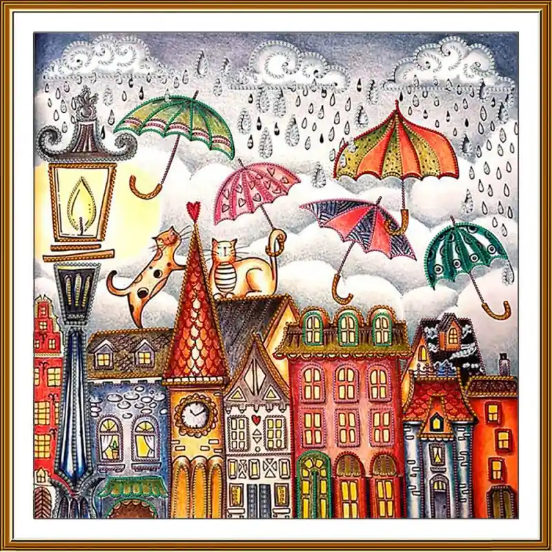 Porta in vita una scena piena di tenerezza, colore e fantasia con il Kit da Ricamo con Perline Love Under an Umbrella di Nova Sloboda. Questo affascinante design urbano raffigura un paesaggio di tetti, gatti innamorati e ombrelli fluttuanti sotto una pioggia magica, ideale per chi ama i dettagli gioiosi e creativi.