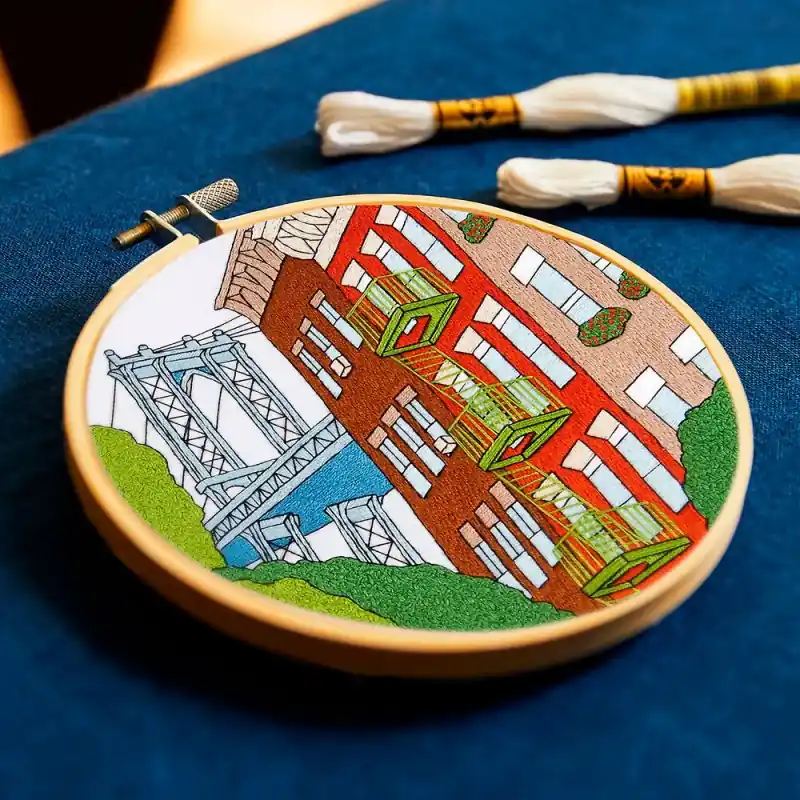 Il Kit per Ricamo New York di DMC, disegnato da Kseniia Guseva, cattura l’essenza vibrante della vita urbana attraverso un’illustrazione architettonica piena di carattere. La scena combina edifici emblematici, scale esterne e un iconico ponte, evocando il ritmo e la personalità inconfondibile della città di New York.