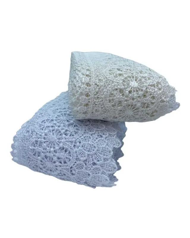 Passamaneria in pizzo macramè con elegante ricamo a cerchi, ideale per rifiniture sartoriali, decorazioni e progetti creativi. Venduta in pezza intera da 19,50 metri. Materiale 100% poliestere, resistente, stabile e facile da cucire.