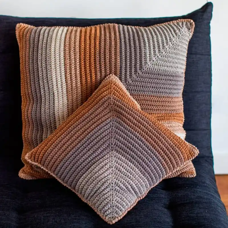 Per realizzare questo cuscino, il kit include 2 gomitoli di Wavy Blends in Caramel Taupe. Questo filo presenta una sfumatura di colori che conferirà al cuscino un aspetto sorprendente, cambiando colore delicatamente nei toni terra e grigio.