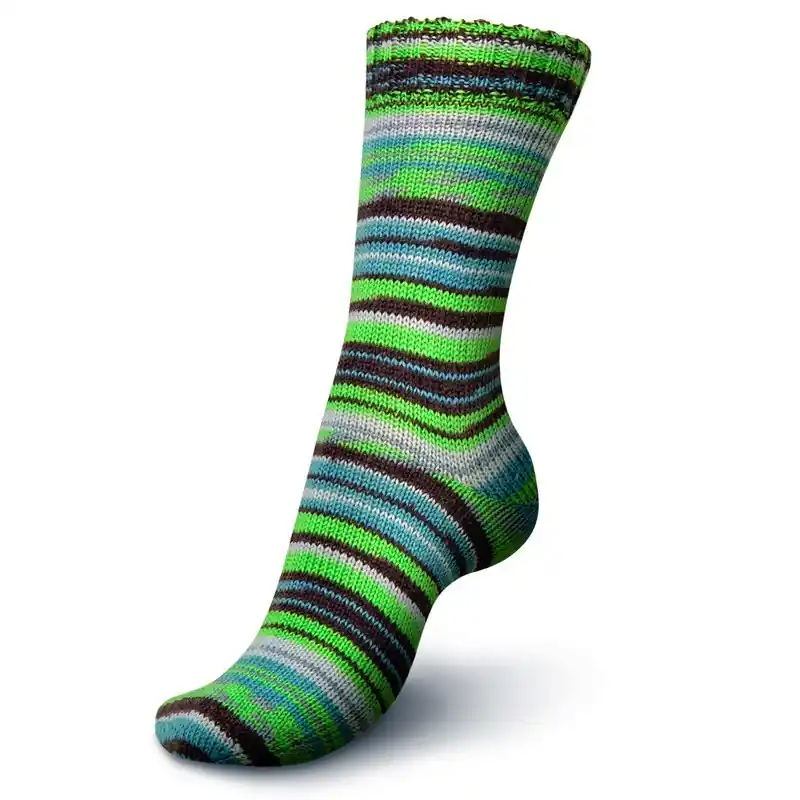 La combinazione di colori di ogni gomitolo conferisce una stampa a righe in differenti colori e spessori. Otterrai calze e calzini dal disegno molto originale.