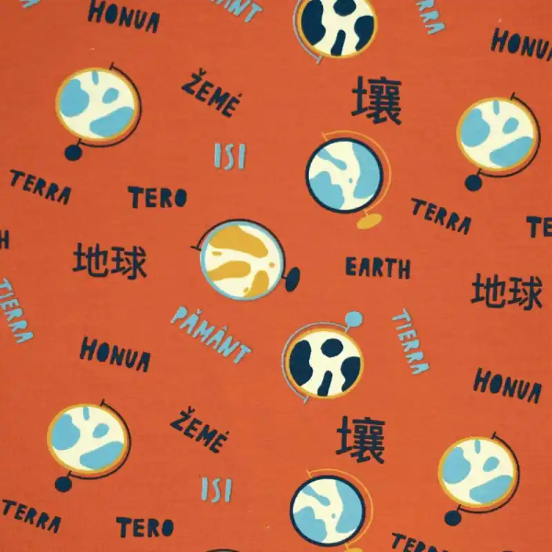 Nella sua stampa originale troverai globi di diversi colori e la parola “Terra” o “Mondo” in diverse lingue. Il suo sfondo è di un colore arancione mattone, molto di moda nella stagione autunnale e invernale.