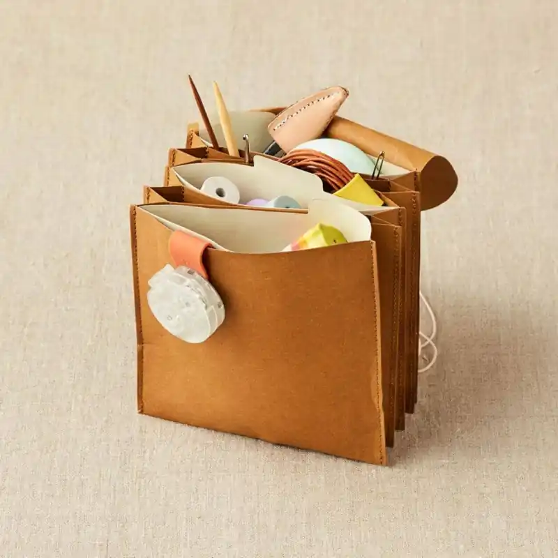 Realizzato in carta kraft lavabile, questo porta progetti è resistente, leggero e rispettoso dell’ambiente. Grazie ai suoi molteplici scomparti e alle linguette rimovibili, offre una soluzione ideale per organizzare piccoli accessori, filati, aghi o schemi.